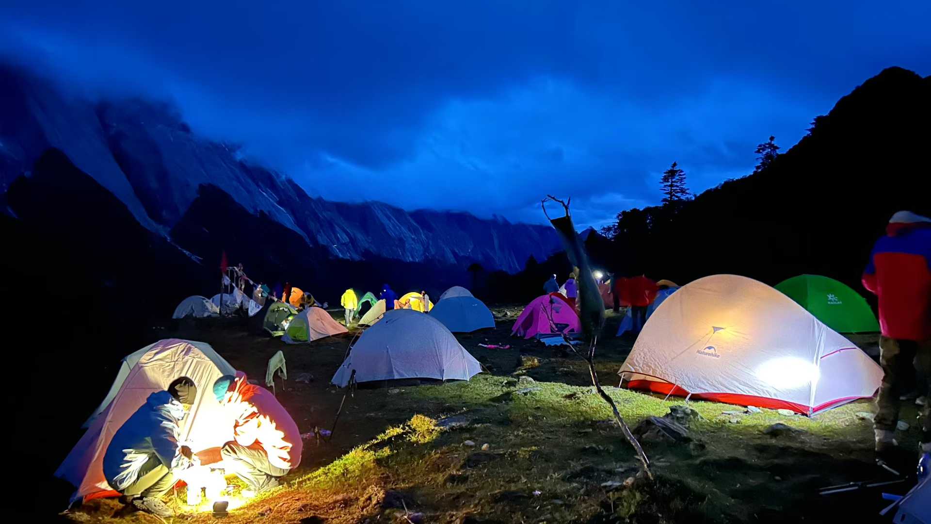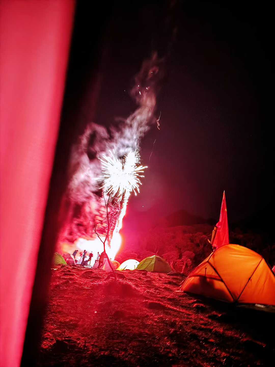 10月2日早上六点半,辉总开车到小区门口,上车出发。当天到达云南迪庆香格里拉,下午2点重装开始徒步。晚上21点多,到达海拨4000多米的哈巴西坡双湖营地扎营,爬升900多米。晚上22点在营地看到了很美的烟花。
